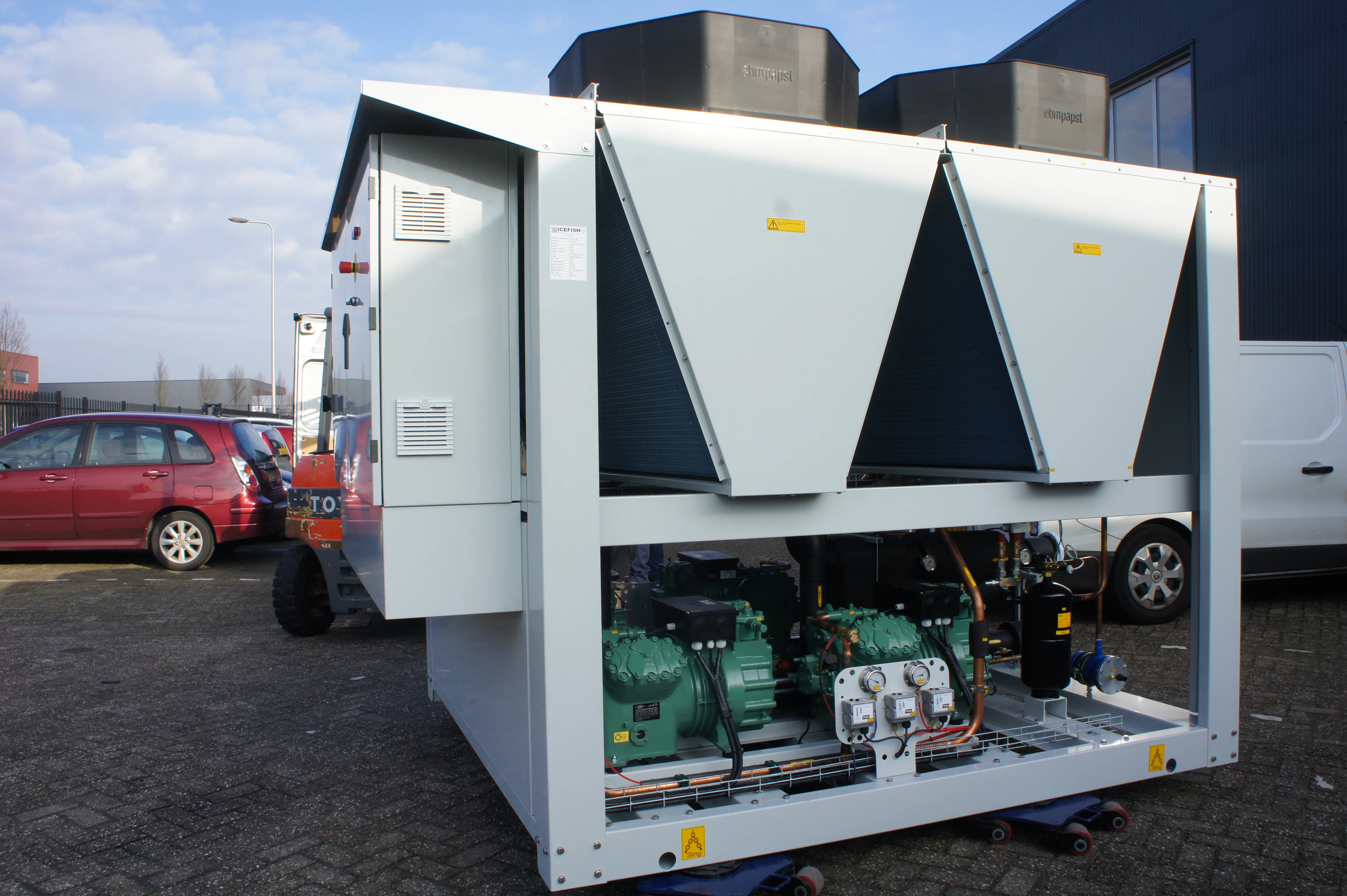 Voor een klant die diverse zuivelverwerkingsapparatuur verkoopt, heeft Icefish een chiller geproduceerd met koudemiddel R407C. Deze chiller ondersteunt de zuivelverwerkingsprocessen met een hoge koelcapaciteit en betrouwbare prestaties, zelfs bij extreme omgevingstemperaturen.